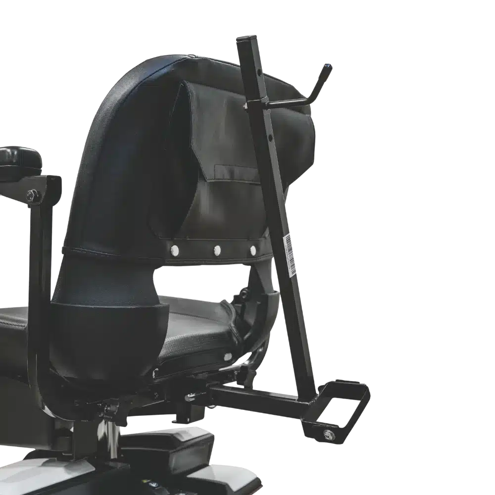 The forearm crutch holder for Pride Mobility scooters easily attaches to the back of many of our electric mobility scooters’ seats. Assembly is simple and includes mounting brackets, assembly screws and an adjustable nut.