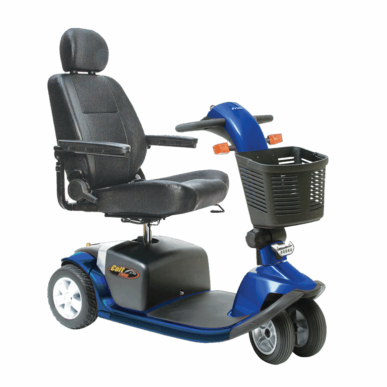 The Colt Twin mobility scooter combines sporty style with dual front wheels for stability, a high-back seat with armrests, and low-profile tyres for comfort.
